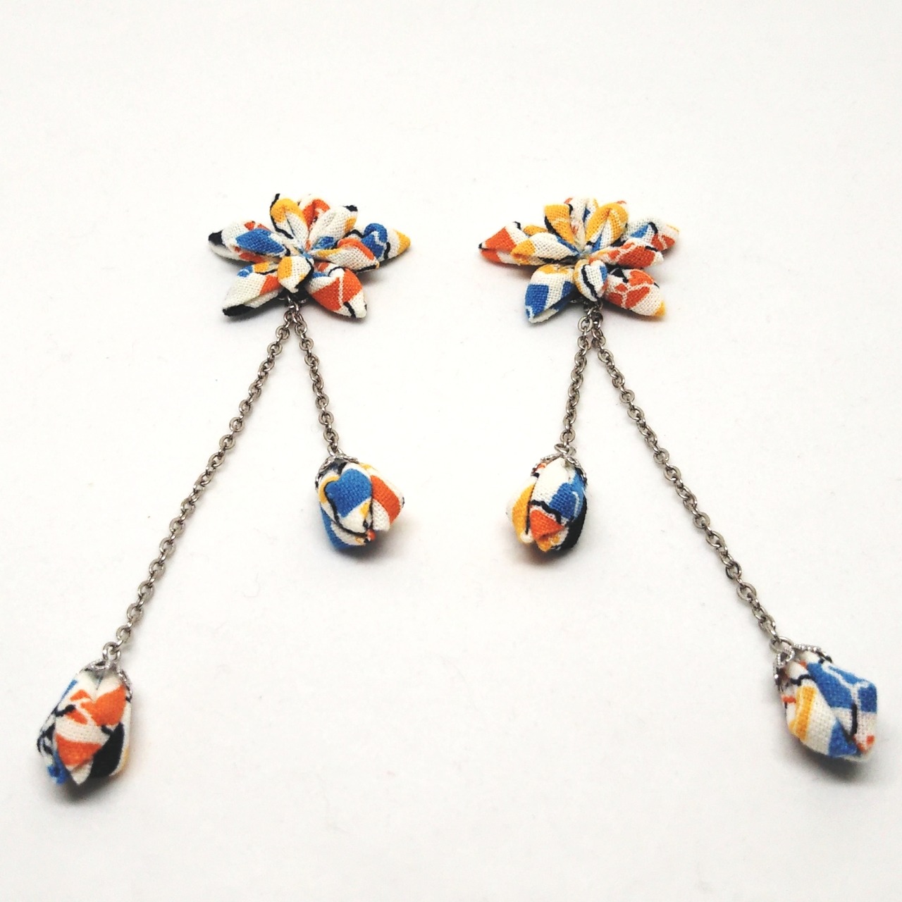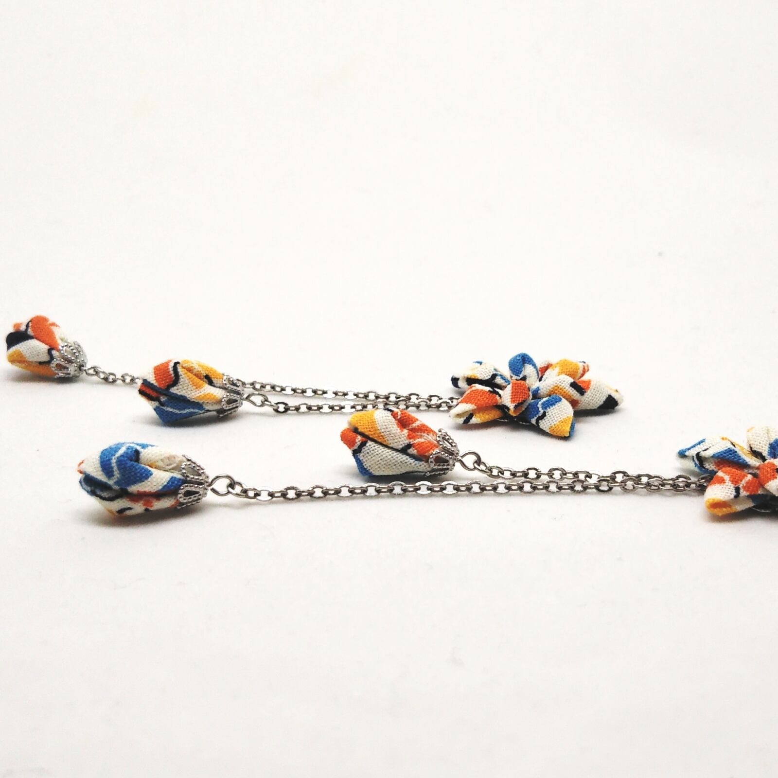 伝統的なつまみ細工をコットンで作り、さらに花座やチェーンを合わせて、よりカジュアルに仕上げました。